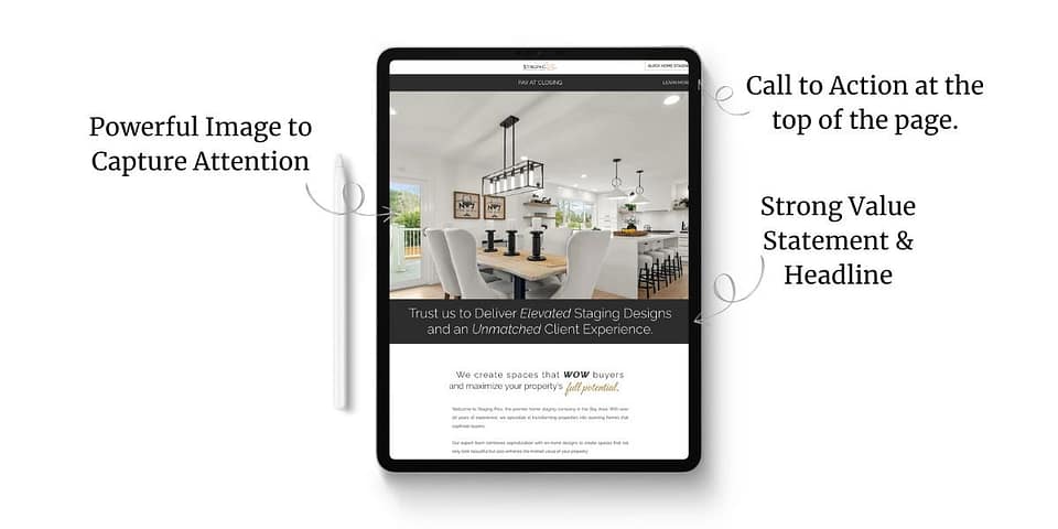 An optimized landing page sets the tone for your entire site and encourages visitors to keep exploring. Not only that, but an optimized landing page makes it easier for visitors to quickly access the information they need without searching your site for it. This is one of those home staging website design tips that really pays off with visitor retention and action.